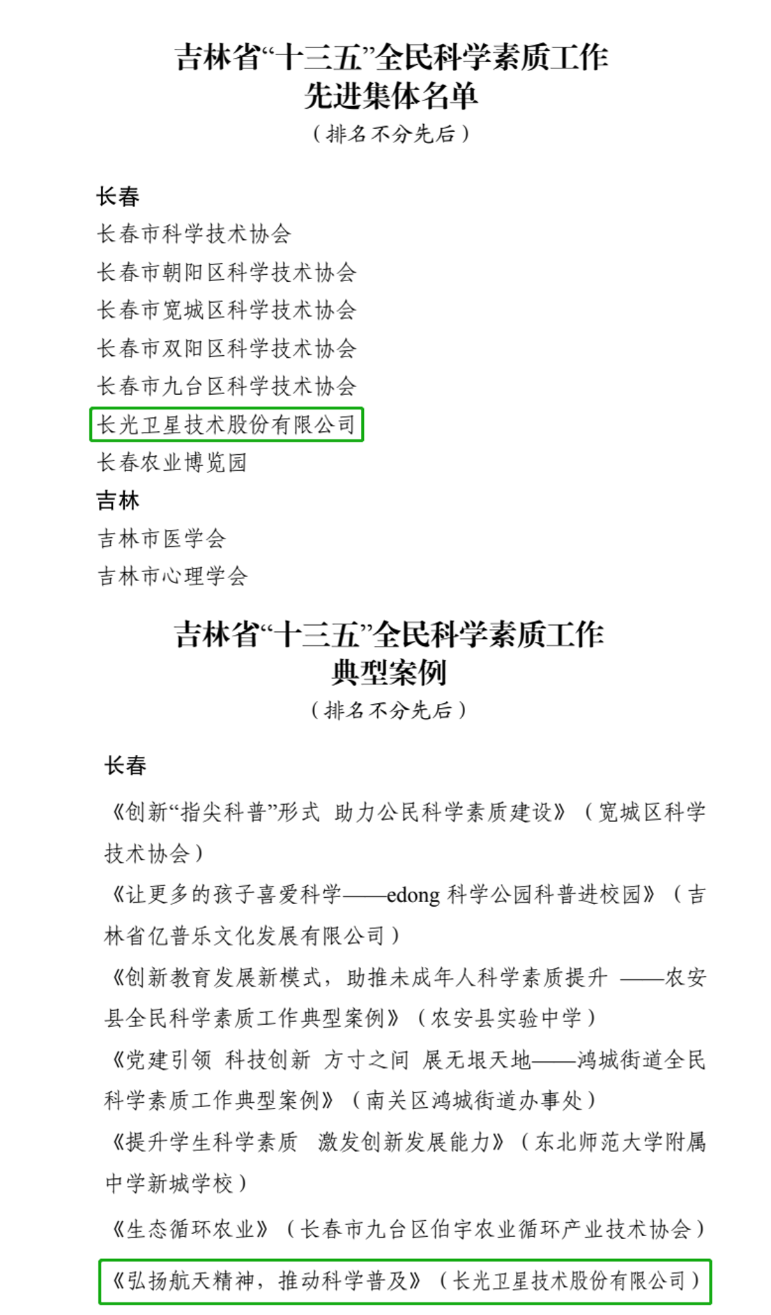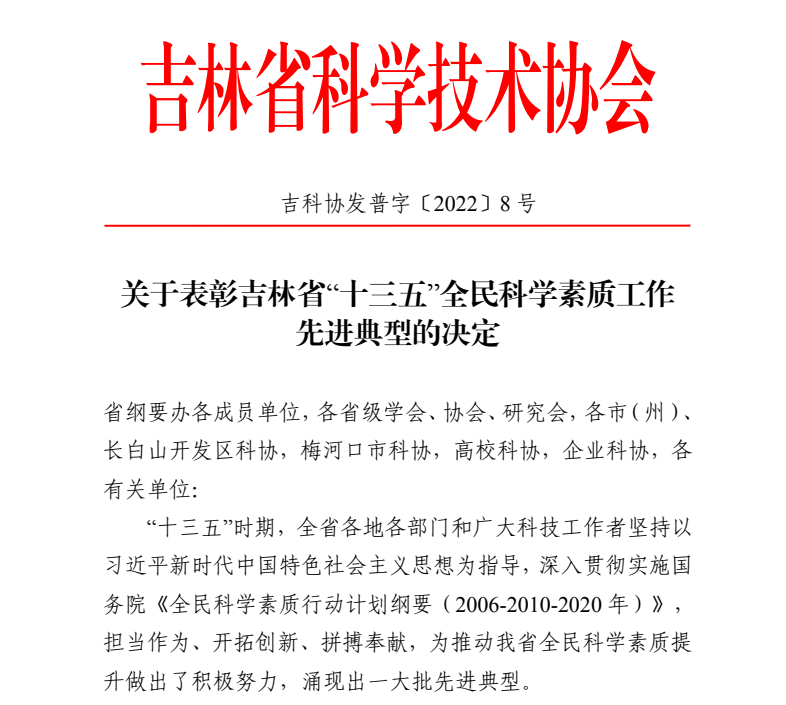 近日,吉林省科学技术协会公布了《关于表彰吉林省“十三五”全民科学素质工作先进典型的决定》,公司荣获“吉林省‘十三五’全民科学素质工作先进集体”、“吉林省‘十三五’全民科学素质工作典型案例” 荣誉称号。同时,公司是获得吉林省“十三五”全民科学素质工作先进集体该项荣誉的唯一一家民营企业。