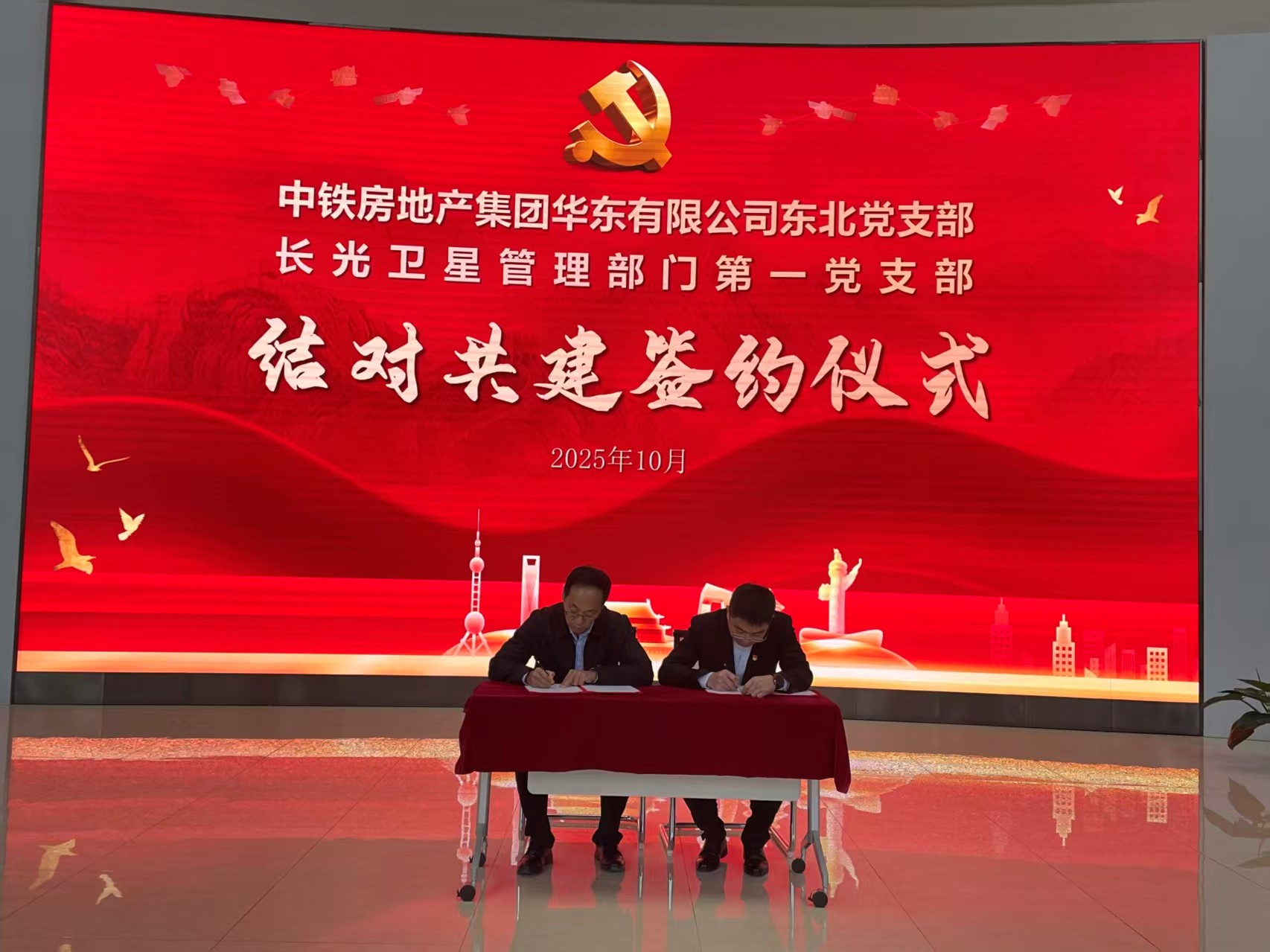 观影前,长光卫星管理部门第一党支部与中铁房地产集团华东有限公司东北党支部联合开展党建共建活动,并现场签署共建协议。未来,双方将围绕“资源共享、优势互补、互促共进”的原则,在党建引领企业高质量发展等方面开展系列务实合作。