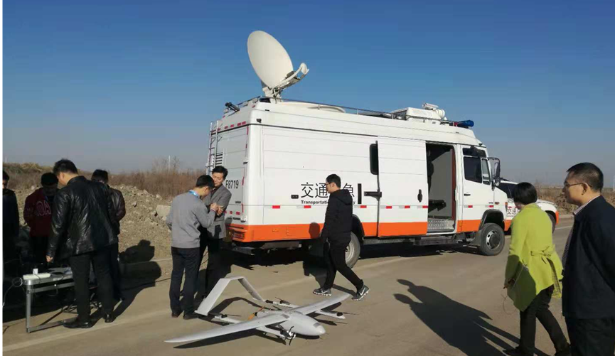 演练现场,吉翔-F15无人机与交通应急卫星通讯车连接测试