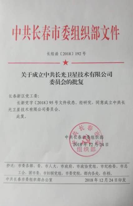 2018年12月24日,经长光卫星技术有限公司申请,中共长春市委组织部批准成立中共长光卫星技术有限公司委员会。