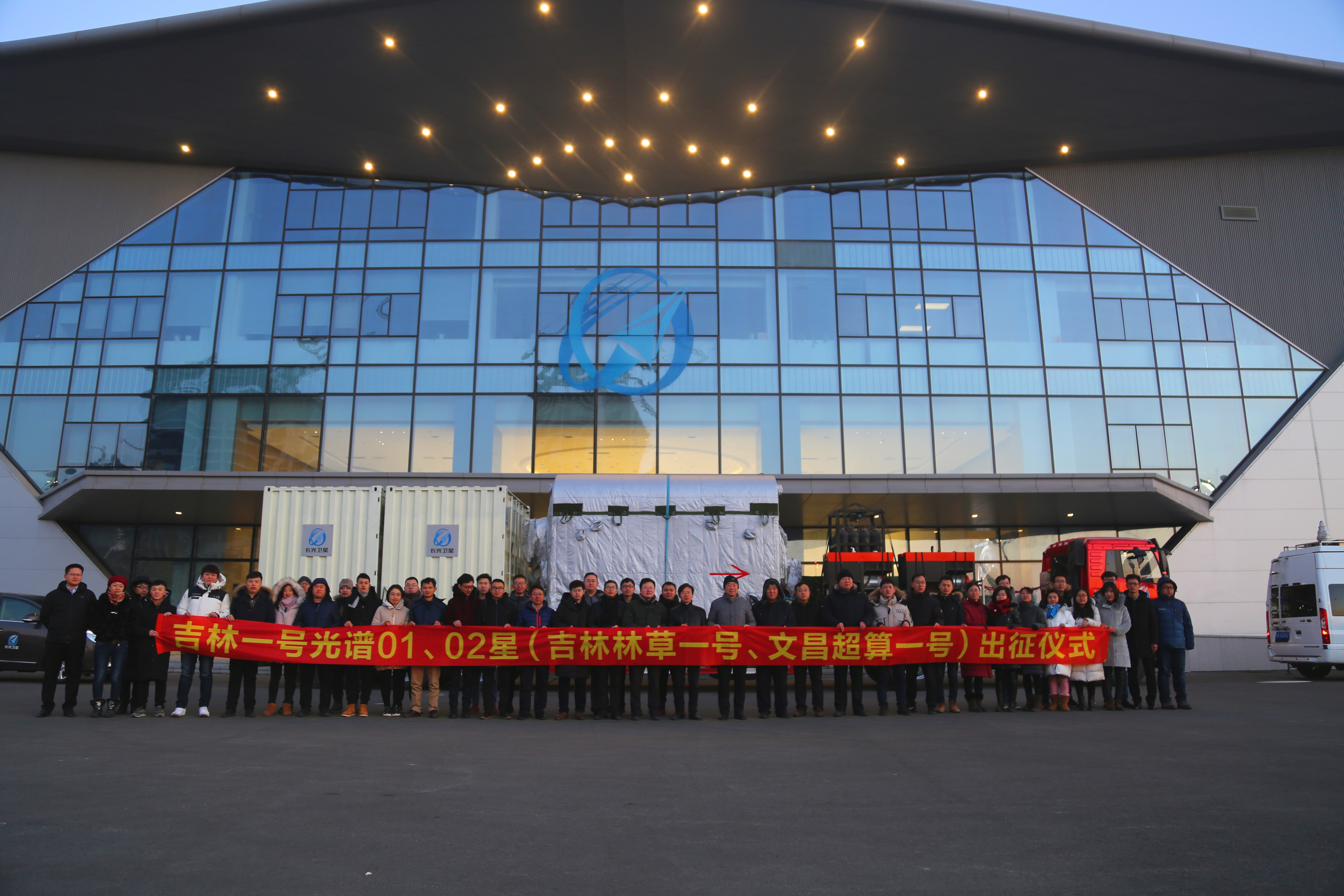 2019年1月3日,公司在航天信息产业园吉星楼前举行“吉林一号”光谱01、02星出征仪式。公司领导、职工代表以及吉林电视台媒体记者汇聚一起,共同见证这一重要时刻。早上07时17分,随着公司董事长、总经理宣明一声令下:“燃放鞭炮,车队出征”, “吉林一号”光谱01、02星搭载着全公司职工的祝福出发前往中国酒泉卫星发射中心。