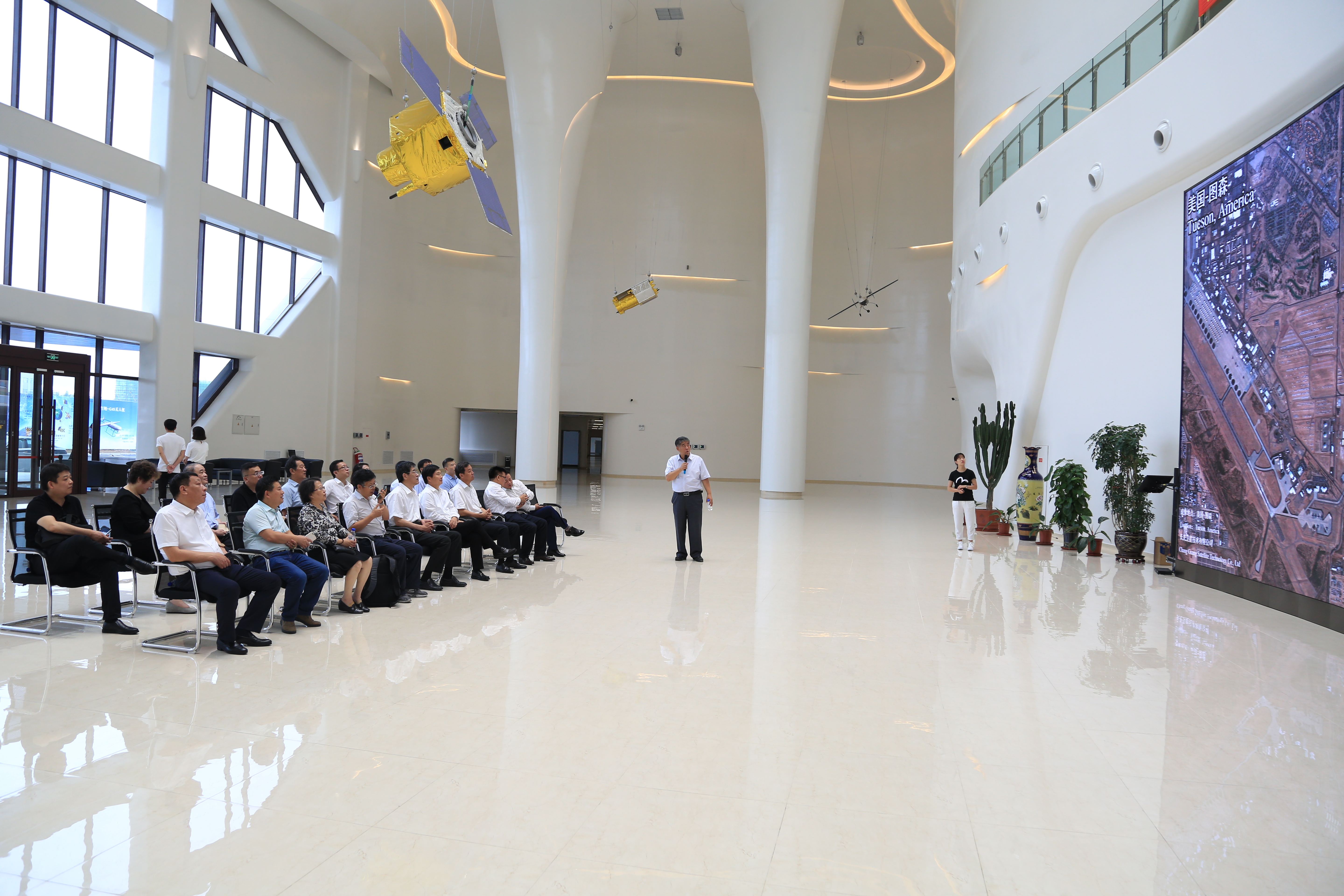 随后调研组一行在贾宏光的带领下,参观了航天科普教育基地,并在“吉星楼”北厅观看了“吉林一号”卫星在林业、交通、水利、环保等领域的应用案例,着重看了江苏省昆山市遥感资源的监测。