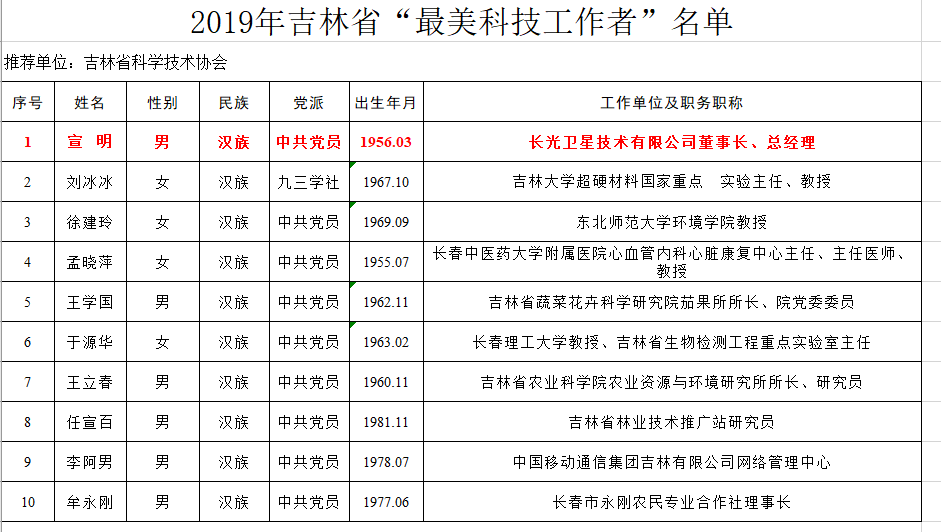 2019年5月30日,吉林省委宣传部、吉林省科协、吉林省科技厅、中科院长春分院联合印发《关于开展2019年“吉林最美科技工作者”评选活动的通知》。经过评选,确定10名2019年“吉林最美科技工作者”,公司董事长、总经理宣明荣获2019年“吉林最美科技工作者”称号。
