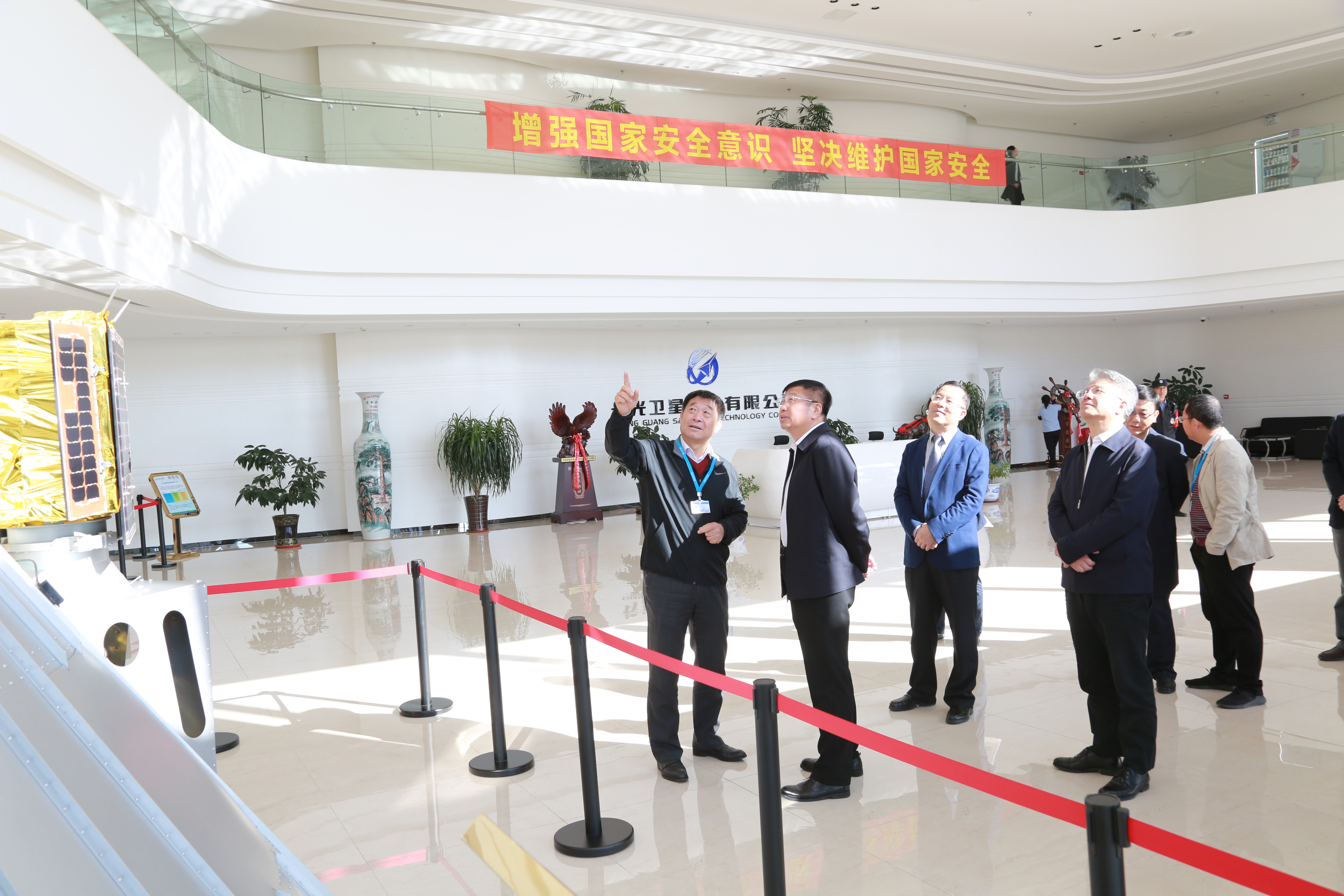 随后,宣明陪同调研组一行先后参观了卫星总装测试厂房及环境试验中心,介绍了公司在研卫星装配、试验情况。宣明说到,依托航天信息产业园,已搭建起了国内一流的生产、检测、试验条件,具备了年产30颗卫星、200架无人机的能力;目前,高分、宽幅等系列卫星按照发射计划如期在研,研制进展顺利,届时星座服务能力将进一步得到提升。