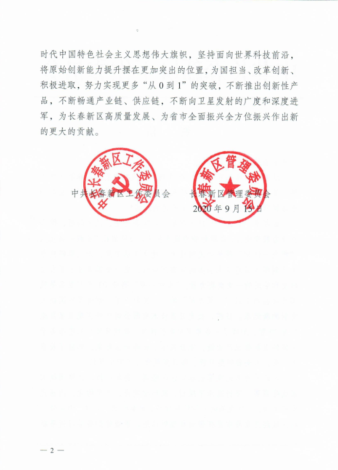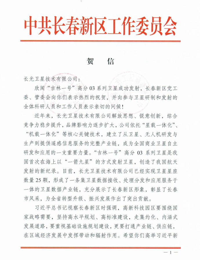 2020年9月15日,公司在黄海海域用长征十一号运载火箭成功将9颗“吉林一号”高分03系列卫星发射升空,卫星顺利进入预定轨道,发射任务取得圆满成功。中共长春新区工作委员会发贺信祝贺,贺信全文如下: