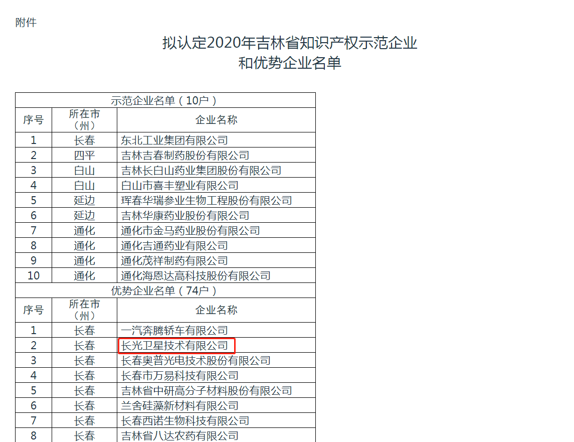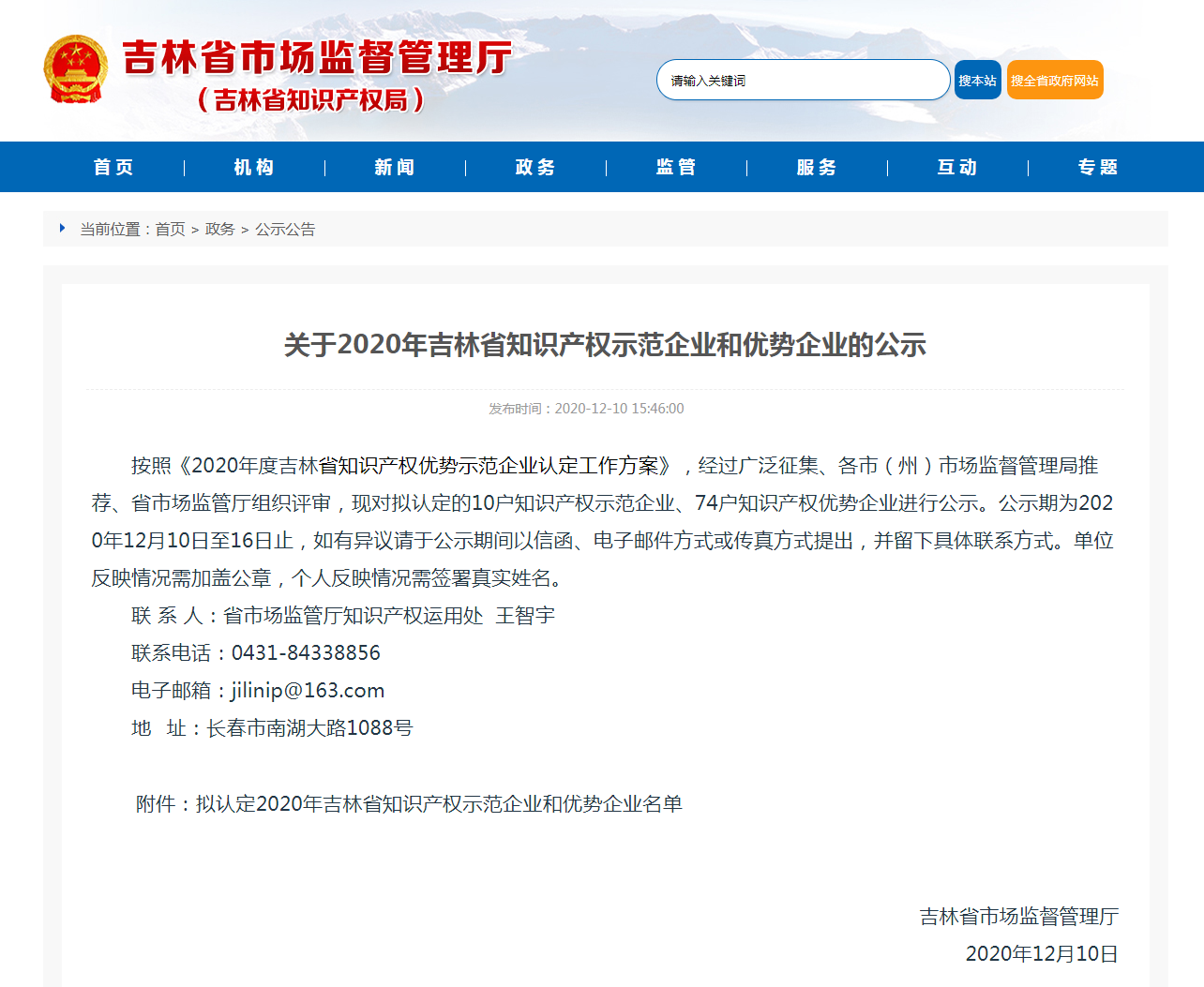 2020年12月,按照《2020年度吉林省知识产权优势示范企业认定工作方案》,经过广泛征集、各市(州)市场监督管理局推荐、省市场监管厅组织评审,吉林省市场监督管理厅公布了2020年吉林省知识产权优势企业名单。公司成功通过“2020年吉林省知识产权优势企业”认定。