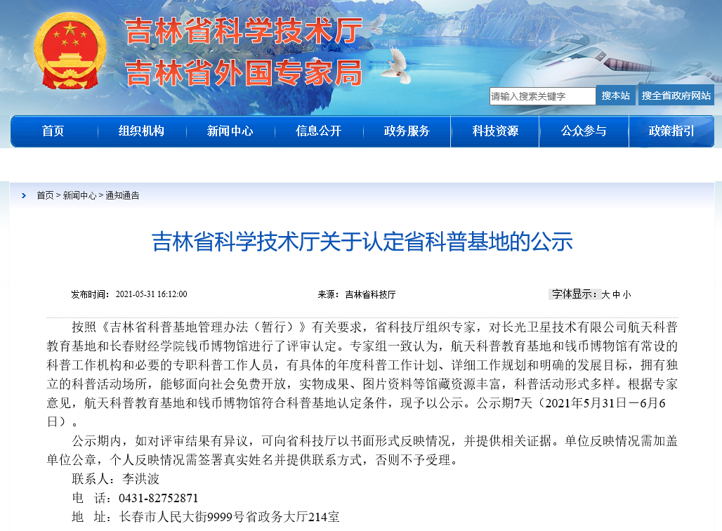 近日,根据吉林省科技厅印发的《吉林省科普基地认定管理办法(暂行)》要求,经过公司申报、专家评定、现场考察等程序,长光卫星技术有限公司航天科普教育基地获评“吉林省科普基地”荣誉称号。