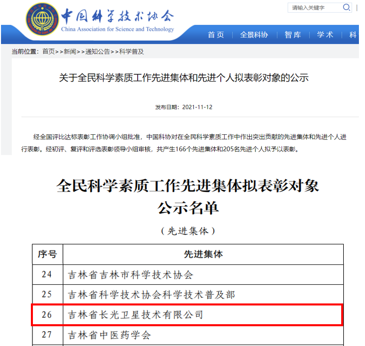 近日,根据《中国科协关于开展全民科学素质工作先进集体和先进个人评选表彰工作的通知》要求,经过公司申报、吉林省科协推荐、全国评比达标表彰工作协调小组评审,长光卫星技术有限公司成功获评全民科学素质工作先进集体荣誉称号。