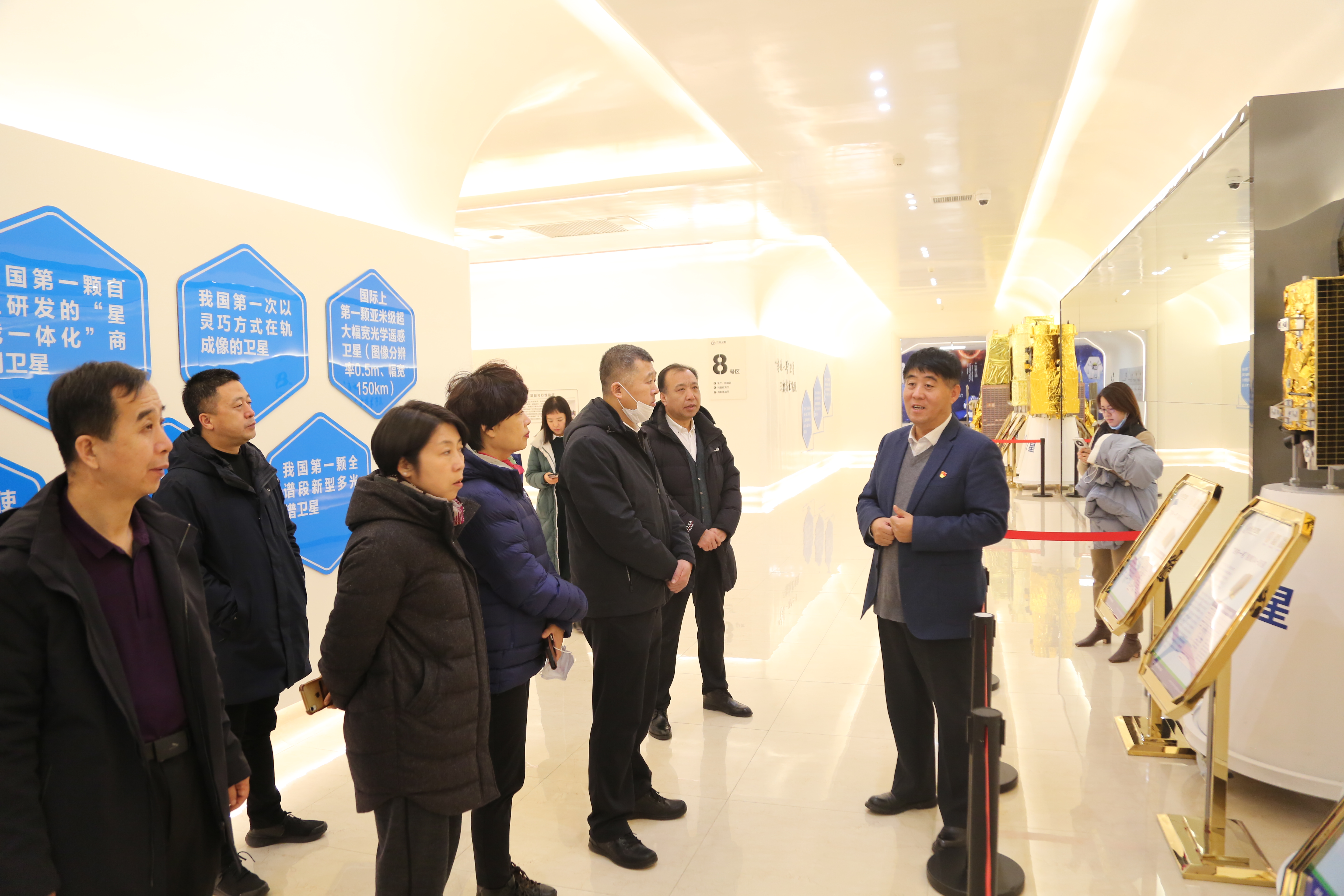 贾宏光陪同丁立涛一行实地察看了“吉林一号”卫星生产车间及公司党建阵地,在介绍公司党建工作时,贾宏光说到,自公司成立以来就高度重视党建工作,在党委的坚强领导下,制定了“抓好党建促科研、围绕科研抓党建”的工作思路,充分发挥党的引领作用和党员先锋模范作用。公司党委始终坚持把党的思想政治建设放在首位,扎实开展“不忘初心、牢记使命”主题教育,在建党百年之际,相继组织开展学习红船精神、传承革命精神等党史教育活动,强根基、塑魂魄,为企业发展注入红色基因。公司党委不断创新工作方法,将党建引领与企业文化交融互动、相互促进,并荣获2021年度“吉林省先进基层党组织”、第一批吉林省“小个专”党建工作示范点等荣誉称号。面向未来,公司党委将继续抓实党建工作精细化管理,团结带领广大党员同志立足新起点、开拓进取,不断创新,以党建引领助推企业高质量发展。