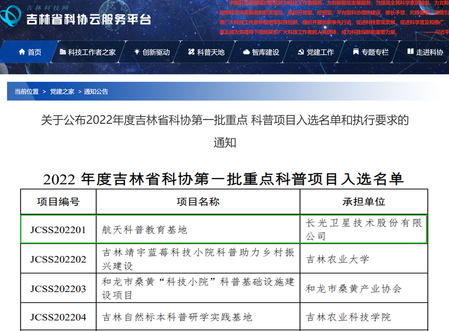 近日,吉林省科学技术协会公布了《2022年度吉林省科协第一批重点科普项目入选名单》,确定第一批入选项目共29项,长光卫星航天科普教育基地成功入选。