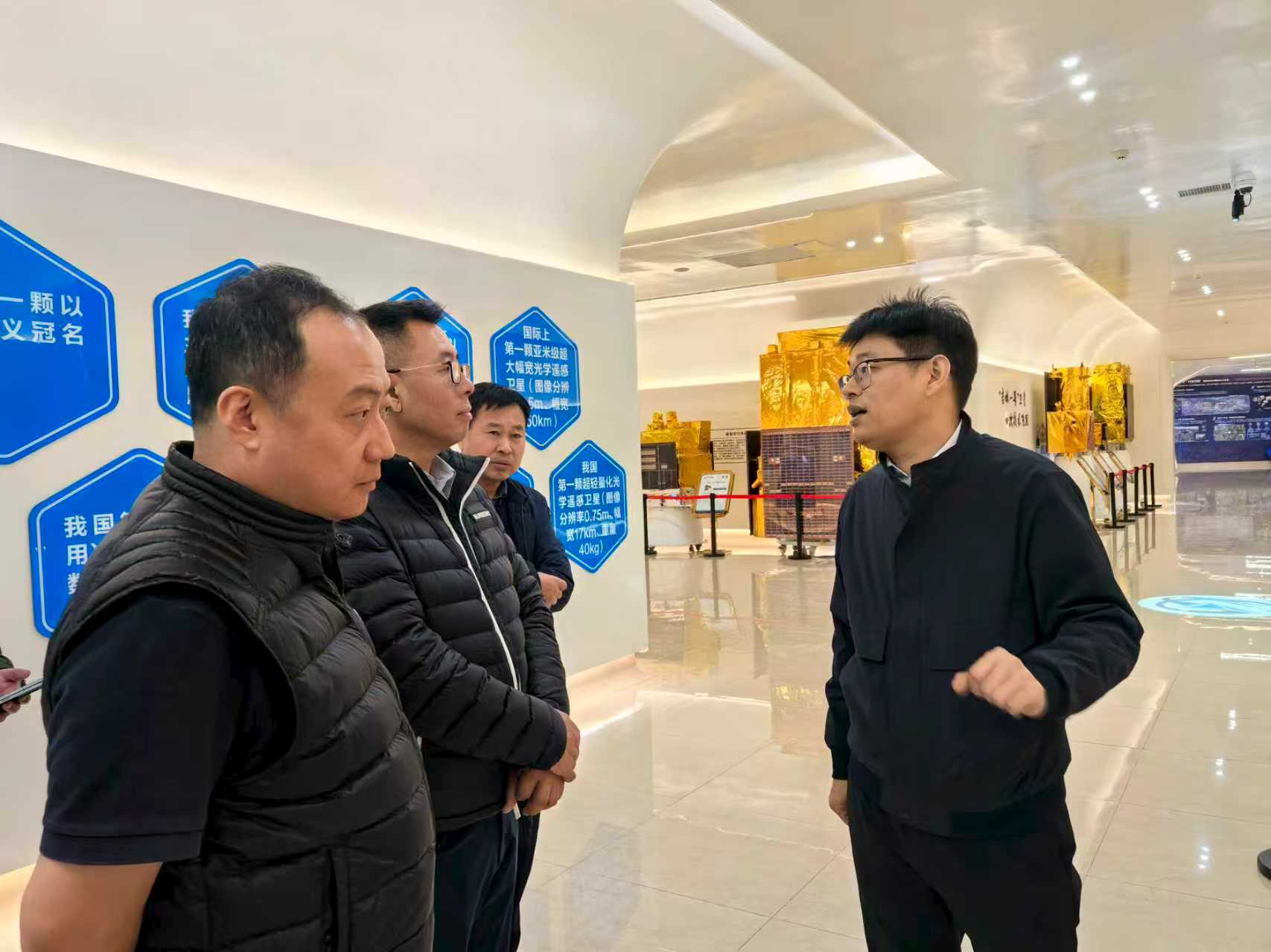 陈茂胜陪同高润峰一行实地参观了光学加工、卫星总装测试等研发生产区域,并就核心关键技术突破、卫星批量化生产产能、“吉林一号”卫星工程建设进展及应用成效等情况进行了详细介绍。陈茂胜说到,公司坚持高端装备制造与航天信息服务融合的发展模式,依托自身在光学遥感领域的技术积累,持续通过技术迭代与应用创新,已在农林、水利、环保、交通、金融、自然资源、城市建设等诸多领域开展精准服务。