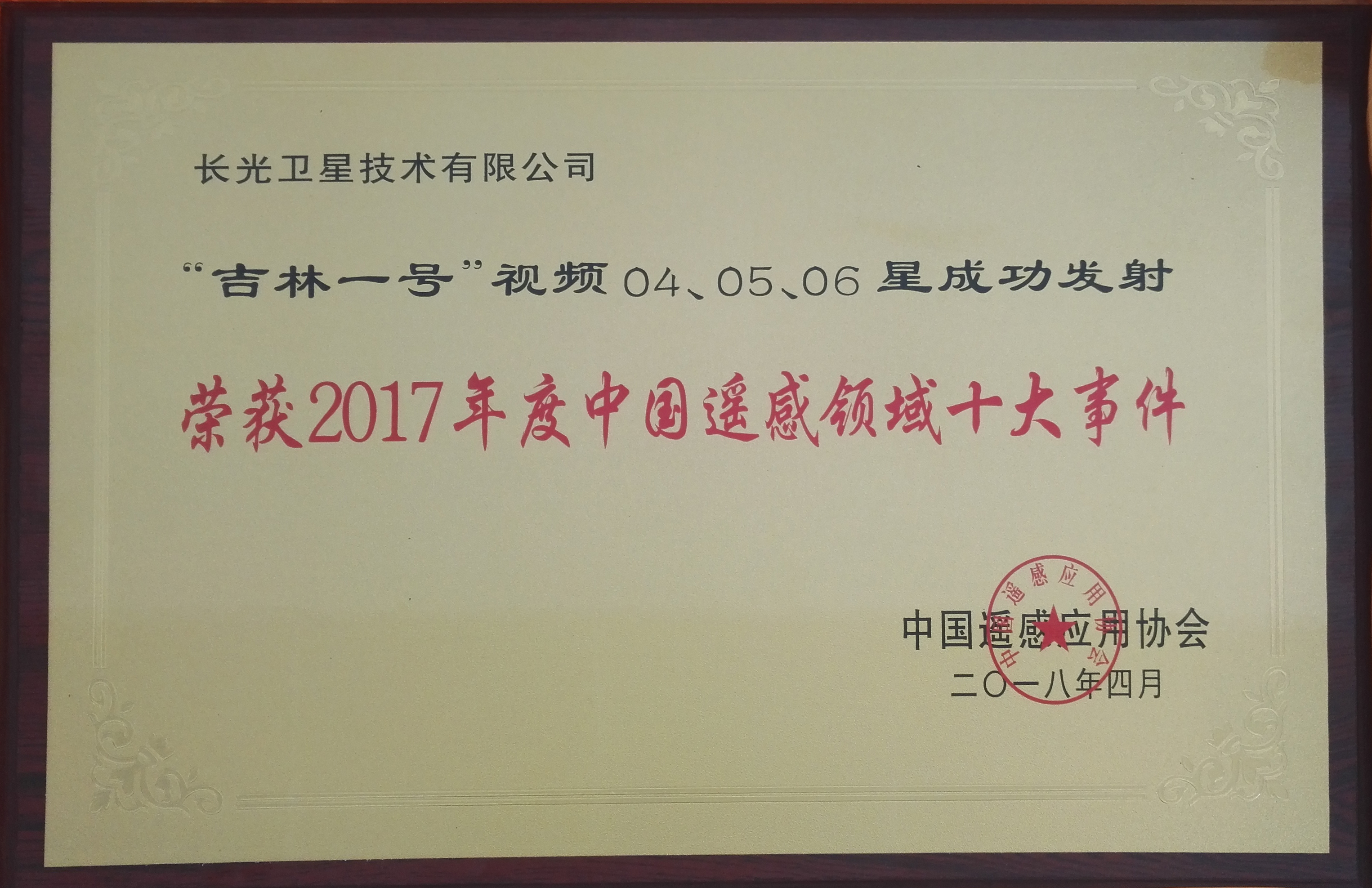 2018年4月23日,中国遥感应用协会2018年年会在哈尔滨召开。两弹一星”元勋、国家最高科学技术奖获得者、中国科学院院士、探月工程总设计师孙家栋,国家国防科技工业局总工程师、国家航天局秘书长田玉龙等著名专家参加会议。会上,“吉林一号”视频04、05、06星成功发射获评“2017年度中国遥感领域十大事件”,中国遥感应用协会副理事长徐文作为颁奖嘉宾,为获奖单位颁奖。
