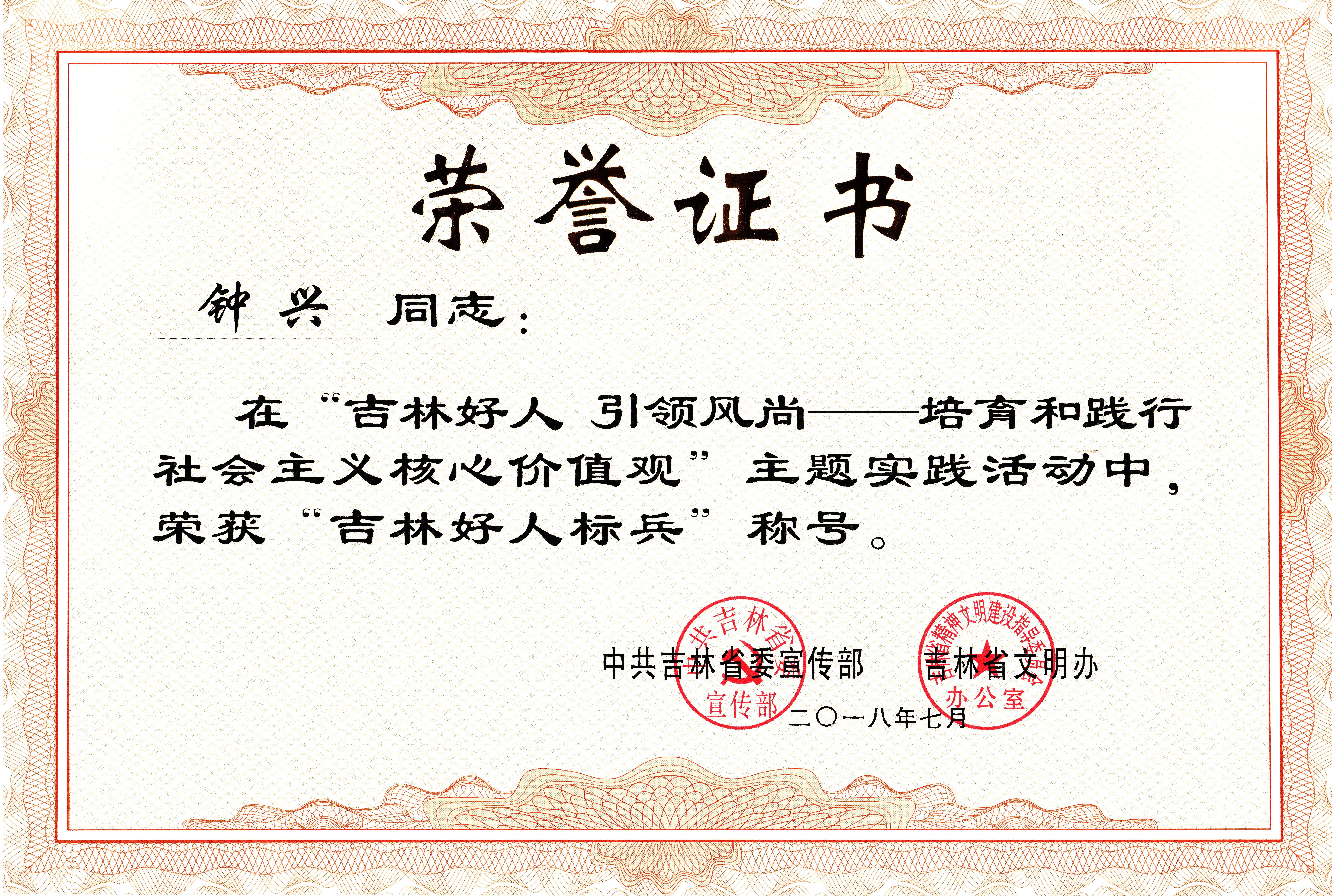 2018年8月1日,由吉林省委宣传部、吉林省文明办、吉林日报、吉林电视台、中国吉林网等主办,经公众网络投票和“吉林好人”评审委员会评审,评选出了2018年第二季度“吉林好人标兵”14名,公司卫星型号总师钟兴荣获“吉林省敬业奉献好人标兵”称号。