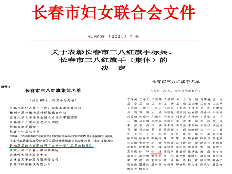 ● 公司“吉林一号”热控团队、测试与通信技术研究室副主任徐婧荣获长春市三八红旗手(集体)称号 2021年3月8日,按照长春市妇女联合会下发的《2020年度长春市三八红旗手(集体)评选表彰活动》的通知要求,经过公司申报、专家评审等程序,“吉林一号”热控团队荣获长春市三八红旗集体称号,测试与通信技术研究室副主任徐婧荣获长春市三八红旗手称号。 2021-03-08