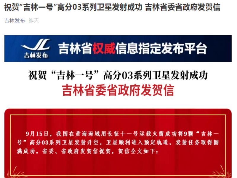 ● 吉林省委省政府向公司致贺电 祝贺“吉林一号”高分03系列卫星发射成功 2020年9月15日,公司在黄海海域用长征十一号运载火箭成功将9颗“吉林一号”高分03系列卫星发射升空,卫星顺利进入预定轨道,发射任务取得圆满成功。吉林省委、省政府发贺信祝贺,贺信全文如下: 2020-09-16