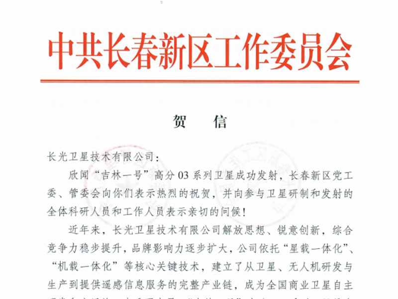 ● 中共长春新区工作委员会向公司致贺信 祝贺“吉林一号”高分03系列卫星发射成功 2020年9月15日,公司在黄海海域用长征十一号运载火箭成功将9颗“吉林一号”高分03系列卫星发射升空,卫星顺利进入预定轨道,发射任务取得圆满成功。中共长春新区工作委员会发贺信祝贺,贺信全文如下: 2020-09-16