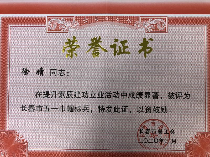 ● 公司测试与通信技术研究室副主任徐婧荣获“长春市五一巾帼标兵”称号 2020年3月,按照长春市总工会下发的《关于开展女职工建功立业活动表彰的通知》要求,经过公司工会申报、专家评选等程序,公司测试与通信技术研究室副主任徐婧荣获“长春市五一巾帼标兵”称号。 2020-05-09