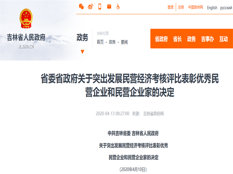 ● 公司董事长、总经理宣明荣获“吉林省卓越贡献民营企业家”称号 2020年4月13日,吉林省服务企业大会在长春召开。省委书记、省人大常委会主任巴音朝鲁出席会议并讲话,省委副书记、省长景俊海主持会议。会上,宣布了关于同意设立“吉林省企业家日”的决定;宣读了吉林省突出发展民营经济考核评比表彰决定,对优秀民营企业和优秀民营企业家进行了表彰。公司董事长、总经理宣明荣获“... 2020-04-13
