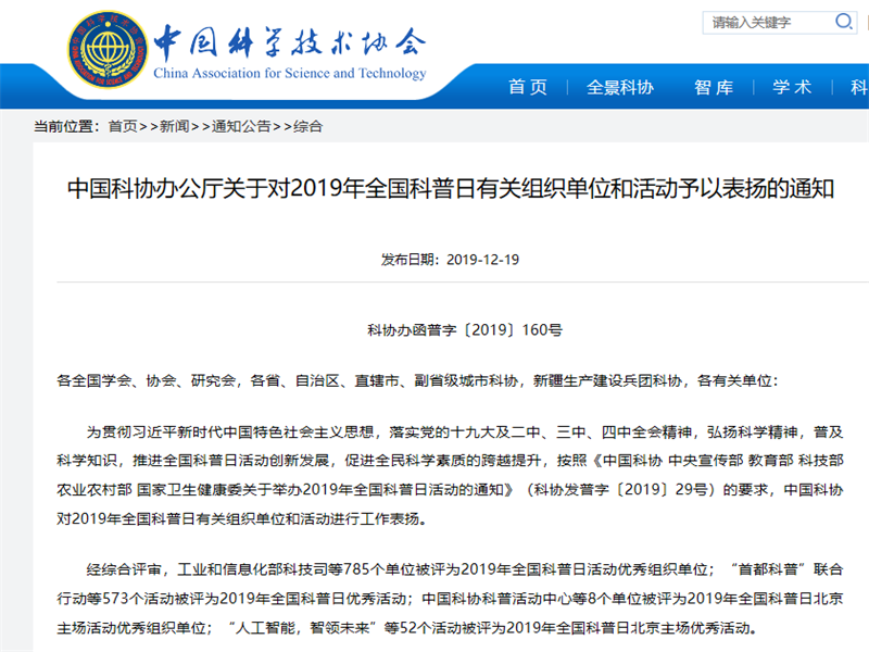 ● 中国科学技术协会授予公司2019年全国科普日活动优秀组织单位荣誉称号 2019年12月19日,中国科学技术协会对2019年全国科普日有关组织单位和活动进行工作表扬。经综合评审,工业和信息化部科技司等785个单位被评为2019年全国科普日活动优秀组织单位,“首都科普”联合行动等573个活动被评为2019年全国科普日优秀活动,公司被授予2019年全国科普日活动优秀组织单位... 2019-12-20