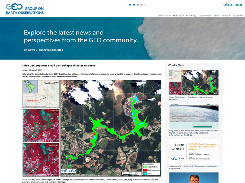 ● 为国际减灾助力:吉林一号卫星再获GEO报道 2019年3月13日,地球观测组织(Group on Earth Observations, GEO)通过Newsletter形式对公司“吉林一号”卫星为巴西提供灾后溃坝现场遥感数据援助进行了报道。公司作为高分辨率卫星数据的主要提供方,得到了国际科学数据委员会CODATA/LODGD主席的高度认可。 2019-03-14