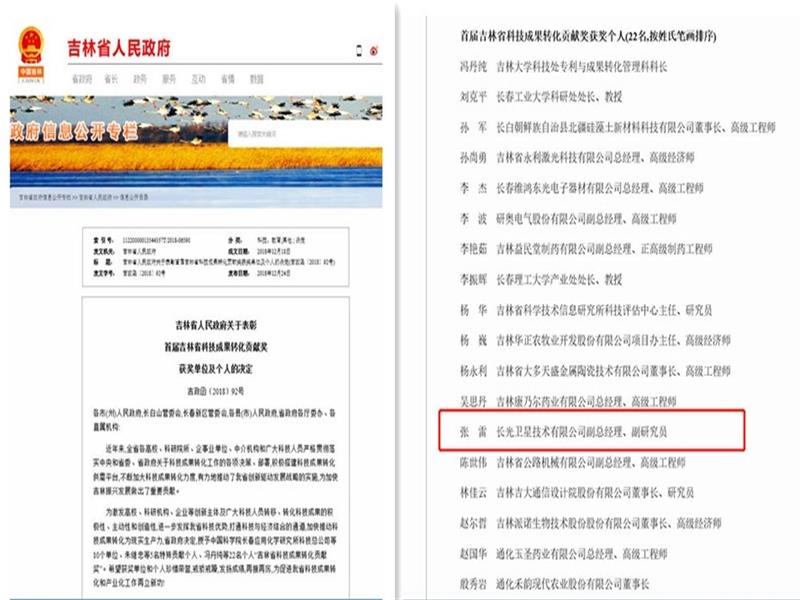 ● 祝贺公司副总经理张雷 荣获“吉林省科技成果转化贡献奖” 2018年8月,吉林省政府决定,由省公务员局、省科技厅等单位共同组织开展首届吉林省科技成果转化贡献奖评审表彰工作。经专家评审及实地核查, 10家单位及27名个人获此奖项。公司副总经理张雷荣获“吉林省科技成果转化贡献奖”。 2018-12-25