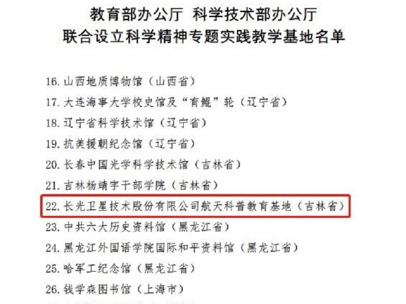● 喜报!公司航天科普教育基地被认定为全国首批“大思政课”实践教学基地-科学精神专题实践教学基地 长光卫星技术股份有限公司航天科普教育基地经教育部办公厅、科学技术部办公厅联合认定为全国首批“大思政课”实践教学基地-科学精神专题实践教学基地。 2022-09-21