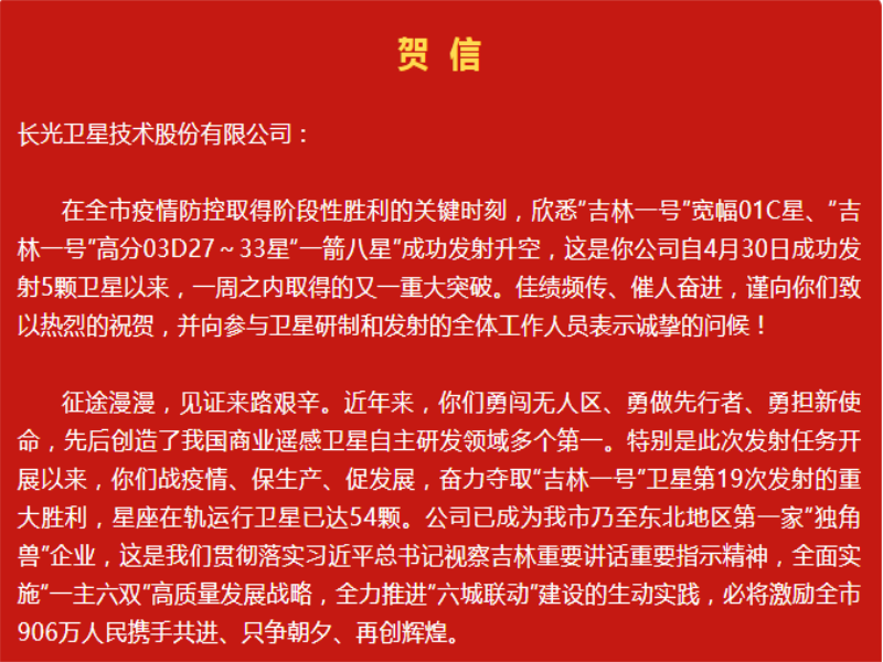 ● 长春市委市政府发贺电祝贺“吉林一号”宽幅01C星、高分03系列卫星成功发射 2022年5月5日,公司自主研发的“吉林一号”宽幅01C星、“吉林一号”高分03D27~33星成功发射,长春市委市政府于第一时间向公司致贺电,对本次任务的成功表示热烈祝贺,并向参与卫星研制和发射的全体工作人员表示诚挚的问候! 2022-05-05