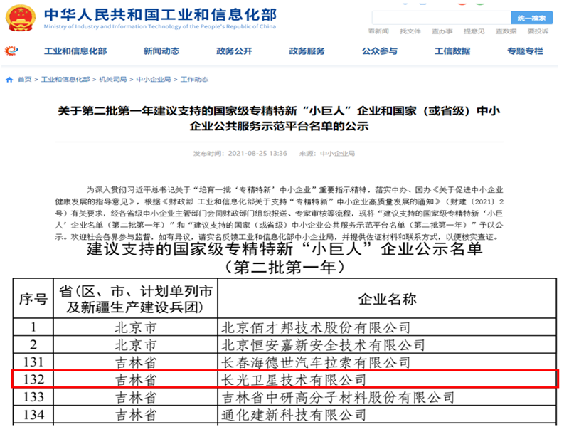 ● 喜报!公司成功入选“建议支持的国家级专精特新‘小巨人’企业”名单 近日,根据《财政部 工业和信息化部关于支持“专精特新”中小企业高质量发展的通知》(财建〔2021〕2号)有关要求,经公司申报、省级中小企业主管部门推荐、专家审核等流程,公司成功入选“第二批第一年建议支持的国家级专精特新‘小巨人’企业”名单。 2021-08-26