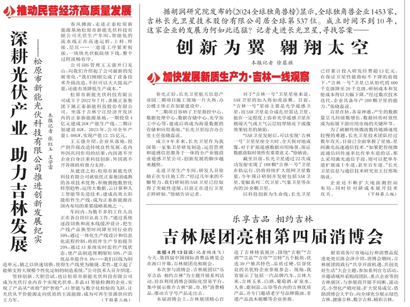 ● 吉林日报-加快发展新质生产力·吉林一线观察 据胡润研究院发布的《2024全球独角兽榜》显示,全球独角兽企业1453家,吉林长光卫星技术股份有限公司居全球第537位。成立时间不到10年,这家企业的发展为何如此迅猛?记者走进长光卫星,寻找答案。 2024-04-14