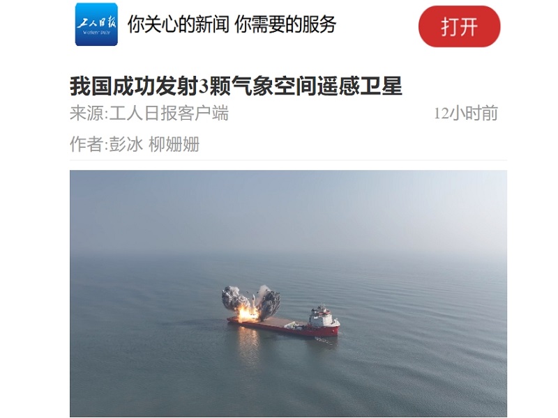 ● 工人日报-我国成功发射3颗气象空间遥感卫星 北京时间2024年1月11日13时30分,我国在山东海阳附近海域使用引力一号遥一商业运载火箭,成功将天津云遥宇航科技有限公司3颗气象空间遥感卫星发射升空,卫星顺利进入预定轨道,发射任务取得圆满成功。 2024-01-12