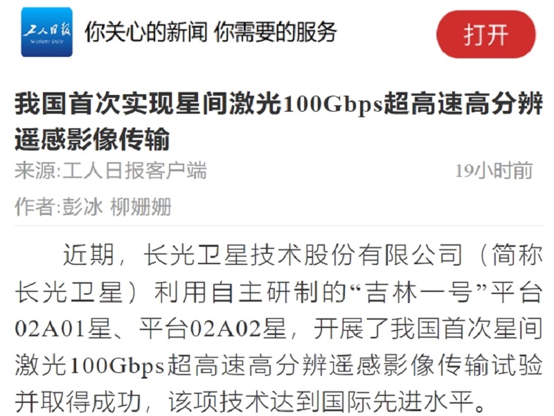● 工人日报-我国首次实现星间激光100Gbps超高速高分辨遥感影像传输 近期,长光卫星技术股份有限公司(简称长光卫星)利用自主研制的“吉林一号”平台02A01星、平台02A02星,开展了我国首次星间激光100Gbps超高速高分辨遥感影像传输试验并取得成功,该项技术达到国际先进水平。 2024-01-11
