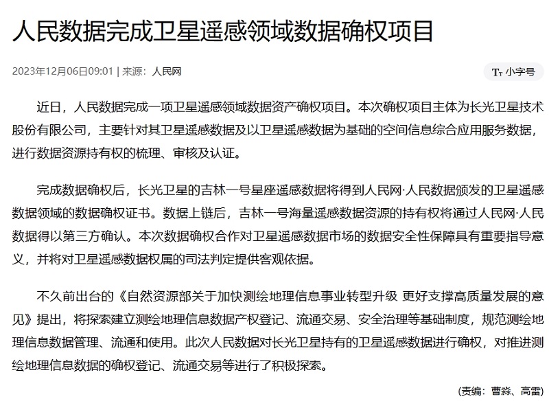 ● 人民网-人民数据完成卫星遥感领域数据确权项目 近日,人民数据完成一项卫星遥感领域数据资产确权项目。本次确权项目主体为长光卫星技术股份有限公司,主要针对其卫星遥感数据及以卫星遥感数据为基础的空间信息综合应用服务数据,进行数据资源持有权的梳理、审核及认证。 2023-12-06
