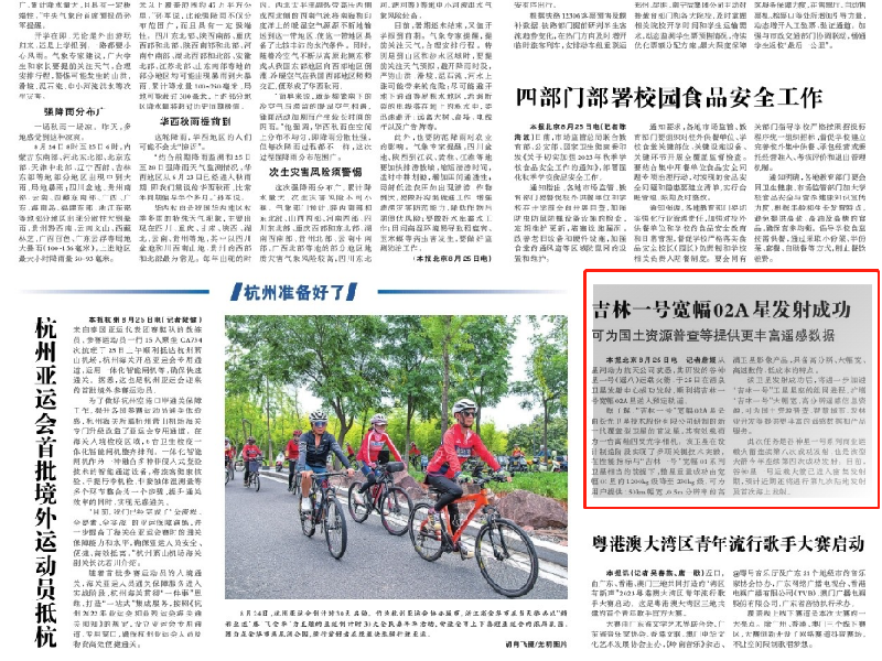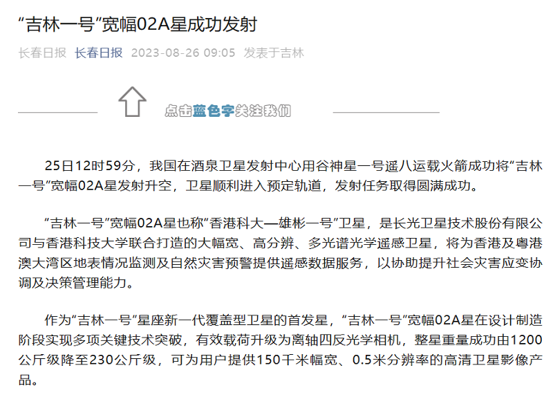 ● 长春日报-“吉林一号”宽幅02A星成功发射 25日12时59分,我国在酒泉卫星发射中心用谷神星一号遥八运载火箭成功将“吉林一号”宽幅02A星发射升空,卫星顺利进入预定轨道,发射任务取得圆满成功。 2023-08-26