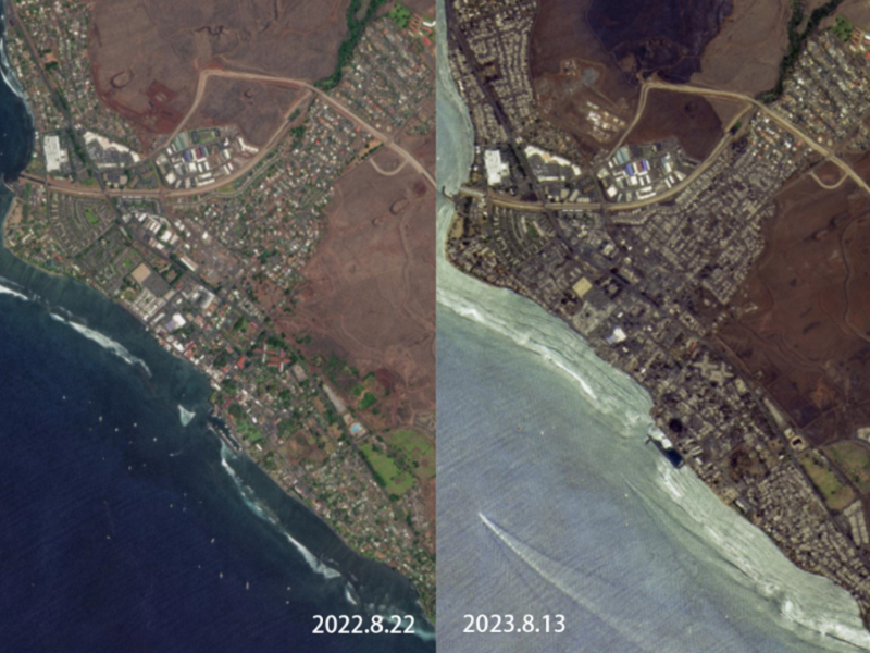 ● 新华社-夏威夷野火死亡110人 卫星图对比触目惊心 野火对当地环境造成了严重损害,从卫星图看,曾经绿意盎然的毛伊岛拉海纳镇在野火后失去了颜色,从高空看仿佛生锈一般。镜头拉近,这座度假小镇满目疮痍,数千栋建筑损毁。 2023-08-17