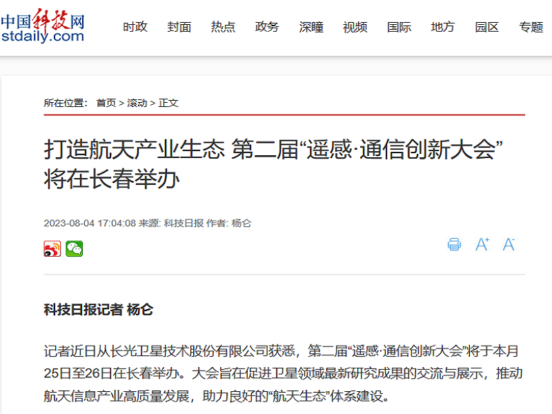 ● 科技日报-打造航天产业生态 第二届“遥感·通信创新大会”将在长春举办 记者近日从长光卫星技术股份有限公司获悉,第二届“遥感·通信创新大会”将于本月25日至26日在长春举办。大会旨在促进卫星领域最新研究成果的交流与展示,推动航天信息产业高质量发展,助力良好的“航天生态”体系建设。 2023-08-04