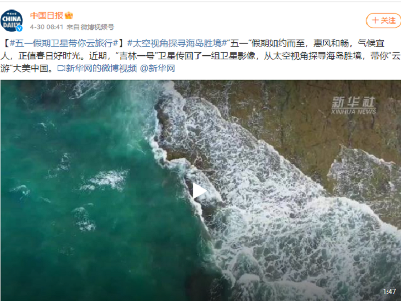● 工人日报-海风轻柔海浪缱绻,一起从太空“瞰”中国绝美海岛! “五一”小长假惠风和畅,气候宜人,在这寻幽探胜的黄金时节,“吉林一号”卫星从太空传回了广西北海涠洲岛、广东汕头南澳岛、海南陵水呆呆岛、福建漳州东山岛等地的卫星影像。海风轻柔、海浪缱绻,让我们跟随卫星的视角,一起从太空探寻绝美海岛胜境,共赴一场悠然自在的“云”旅行! 2023-05-03