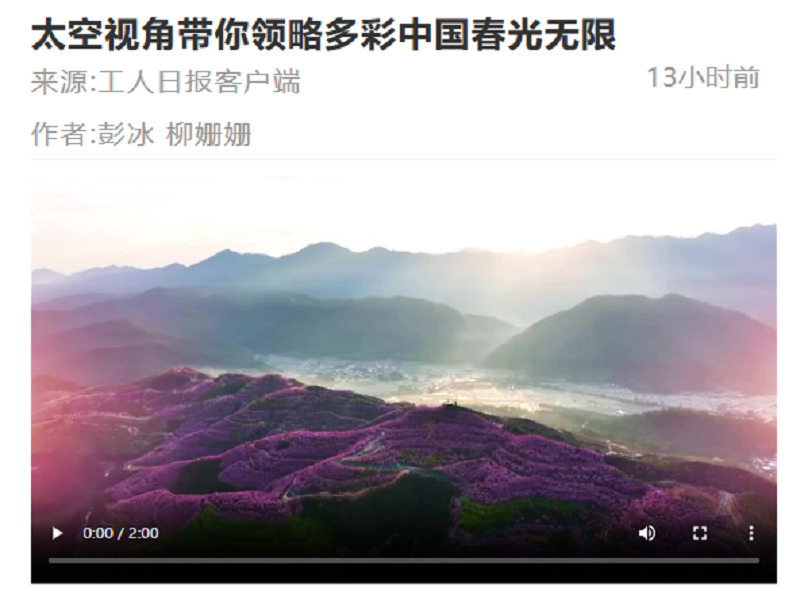 ● 工人日报-太空视角带你领略多彩中国春光无限 芳原绿野恣行时,春入遥山碧四围。2023年春天如约而至,芳菲春色,如诗如画,正是踏春郊游的好时候。近期,“吉林一号”卫星从太空传回了云南宜良山后樱花谷、贵州贵阳百花湖、广西桂林山水、云南大理苍山洱海、甘肃张掖丹霞地质公园等地的卫星影像,从太空视角领略多彩中国,探寻春意盎然、共赴春光无限。 2023-04-05