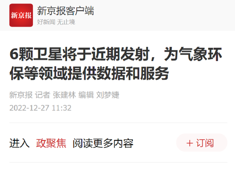 ● 国际在线-吉林:6颗卫星出征 近期将在中国太原卫星发射中心择期发射 2022年12月27日,长光卫星技术股份有限公司在长春航天信息产业园举行“华水一号”卫星、“沃福曼号”卫星、“海河一号”卫星、“吉林一号”高分03D34星、“吉林一号”MF02A03/04等6颗卫星的出征仪式。长光卫星技术股份有限公司及合作单位的领导和职工代表参加活动。 2022-12-27