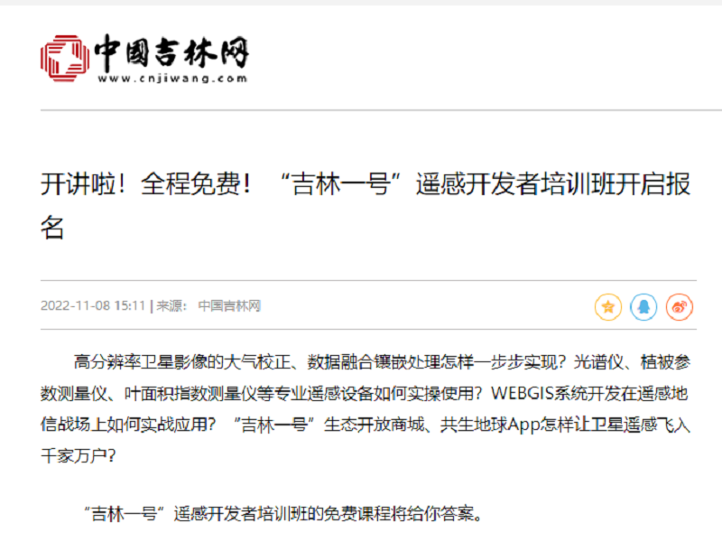 ● 中国吉林网-开讲啦!全程免费!“吉林一号”遥感开发者培训班开启报名 高分辨率卫星影像的大气校正、数据融合镶嵌处理怎样一步步实现?光谱仪、植被参数测量仪、叶面积指数测量仪等专业遥感设备如何实操使用?WEBGIS系统开发在遥感地信战场上如何实战应用?“吉林一号”生态开放商城、共生地球App怎样让卫星遥感飞入千家万户? 2022-11-08