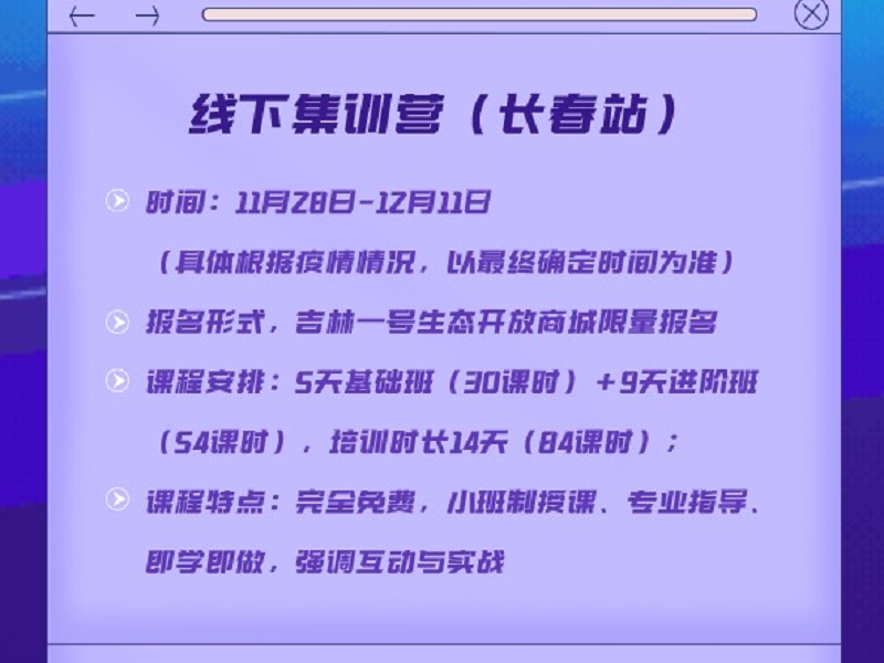 ● 吉林日报-快来报名!“吉林一号”遥感开发者公益培训班即将开课 记者从长光卫星技术股份有限公司了解到,“吉林一号”遥感开发者公益培训班将在长春举行,线下公益集训营拟定于11月28日至12月11日开班,线上全球课堂将于12月上线视频。 2022-11-08