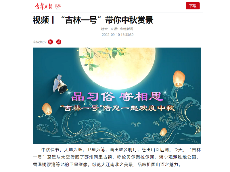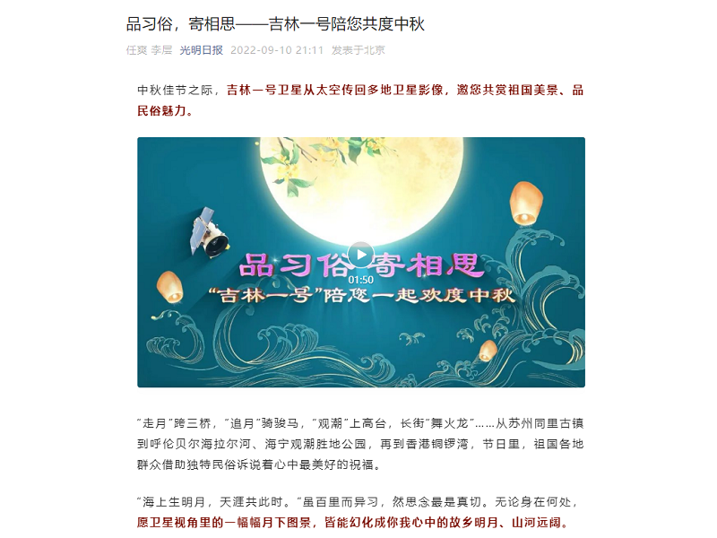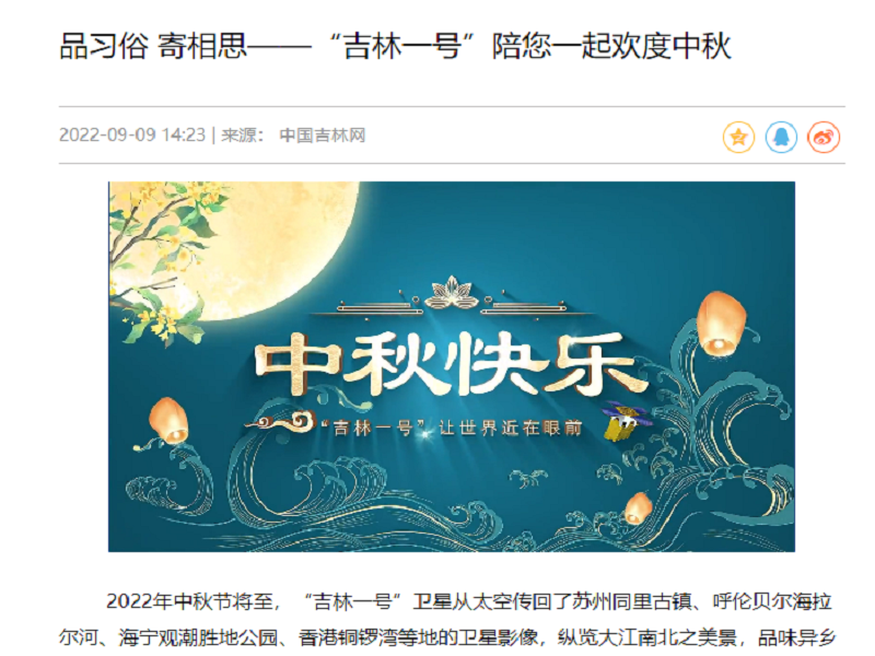 ● 光明日报-品习俗,寄相思——吉林一号陪您共度中秋 中秋佳节之际,吉林一号卫星从太空传回多地卫星影像,邀您共赏祖国美景、品民俗魅力。“海上生明月,天涯共此时。”虽百里而异习,然思念最是真切。无论身在何处,愿卫星视角里的一幅幅月下图景,皆能幻化成你我心中的故乡明月、山河远阔。 2022-09-10