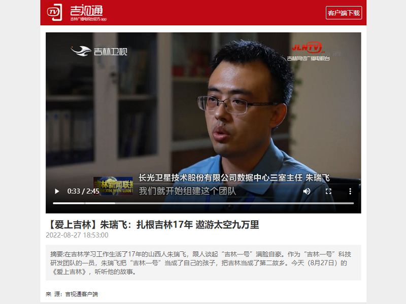 ● 吉视通-【爱上吉林】朱瑞飞:扎根吉林17年 遨游太空九万里 在吉林学习工作生活了17年的山西人朱瑞飞,跟人谈起“吉林一号”满脸自豪。作为“吉林一号”科技研发团队的一员,朱瑞飞把“吉林一号”当成了自己的孩子,把吉林当成了第二故乡。今天(8月27日)的《爱上吉林》,听听他的故事。 2022-08-27
