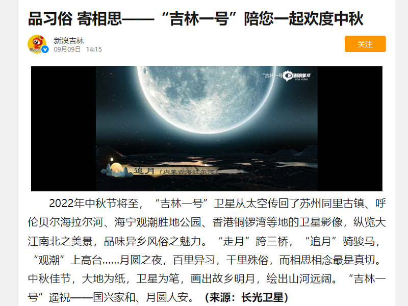 ● 新浪吉林-品习俗 寄相思——“吉林一号”陪您一起欢度中秋 2022年中秋节将至,“吉林一号”卫星从太空传回了苏州同里古镇、呼伦贝尔海拉尔河、海宁观潮胜地公园、香港铜锣湾等地的卫星影像,纵览大江南北之美景,品味异乡风俗之魅力。“走月”跨三桥,“追月”骑骏马,“观潮”上高台……月圆之夜,百里异习,千里殊俗,而相思相念最是真切。中秋佳节,大地为纸,卫星为笔,画出... 2022-09-09