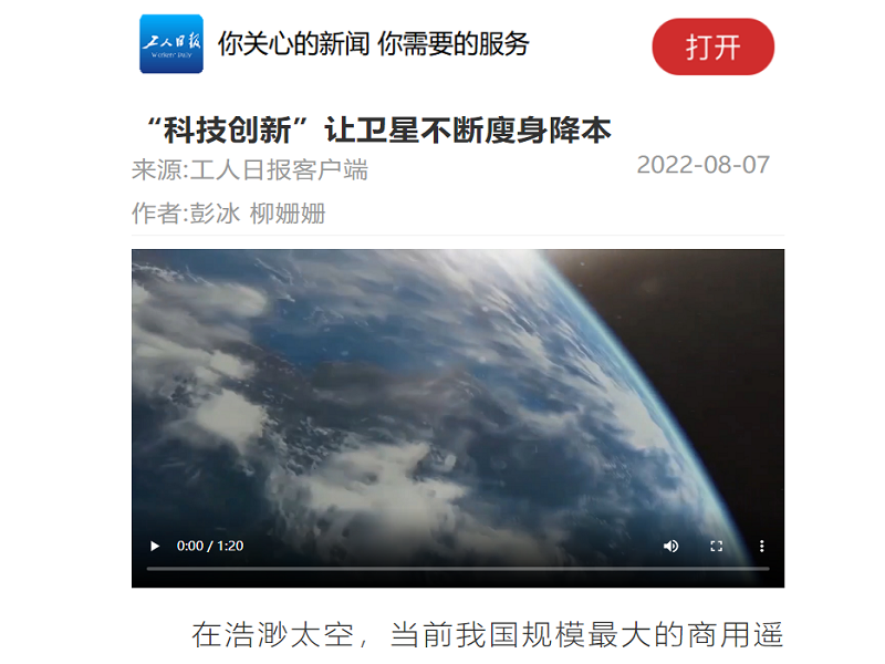 ● 工人日报-“科技创新”让卫星不断廋身降本 在浩渺太空,当前我国规模最大的商用遥感卫星星座“吉林一号”正不知疲倦地扫描地球,将海量卫星影像实时传送回地面。从7年前首颗“吉林一号”升空,到如今54颗在轨,源于不懈自主创新,“吉林一号”的重量和成本双双数量级降低,有力推动了我国商用卫星遥感应用阔步走向 “大众消费”时代。 2022-08-07