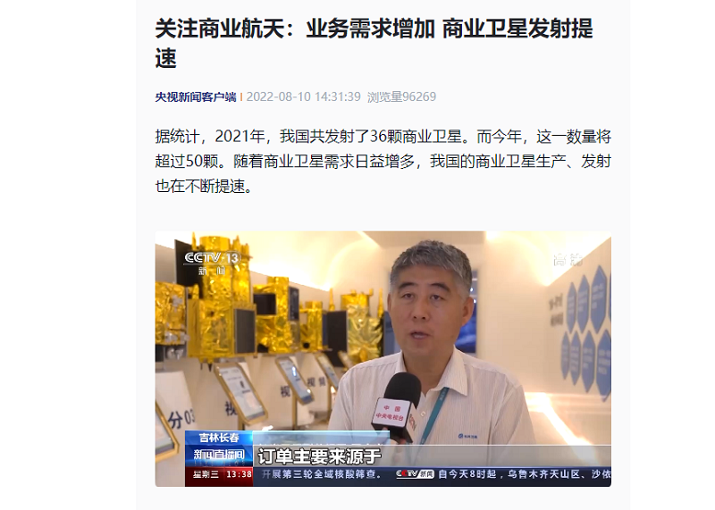 ● CCTV13央视新闻-关注商业航天:业务需求增加 商业卫星发射提速 据统计,2021年,我国共发射了36颗商业卫星。而今年,这一数量将超过50颗。随着商业卫星需求日益增多,我国的商业卫星生产、发射也在不断提速。 2022-08-10