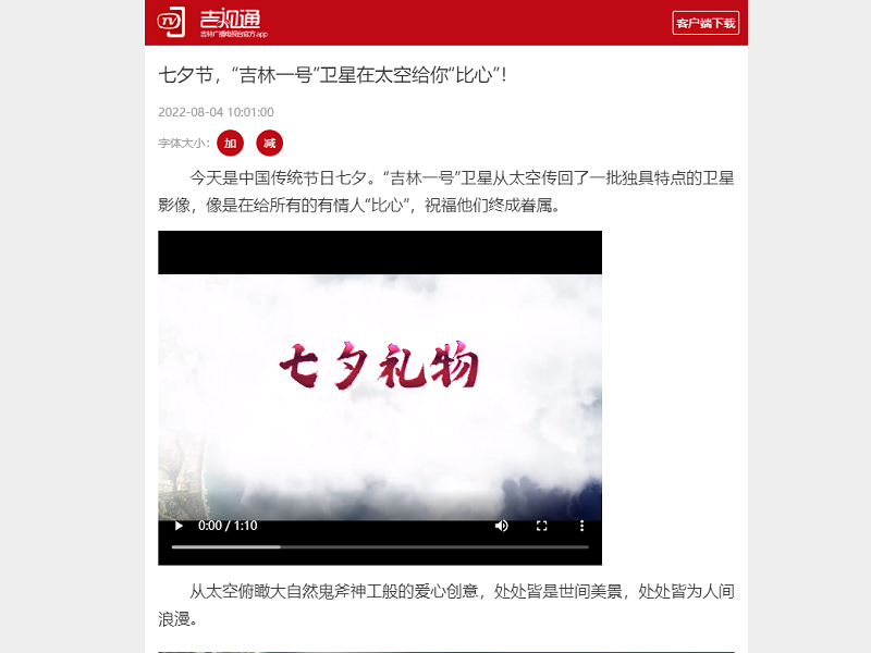 ● 吉视通-七夕节,“吉林一号”卫星在太空给你“比心”! 今天是中国传统节日七夕。“吉林一号”卫星从太空传回了一批独具特点的卫星影像,像是在给所有的有情人“比心”,祝福他们终成眷属。 2022-08-04