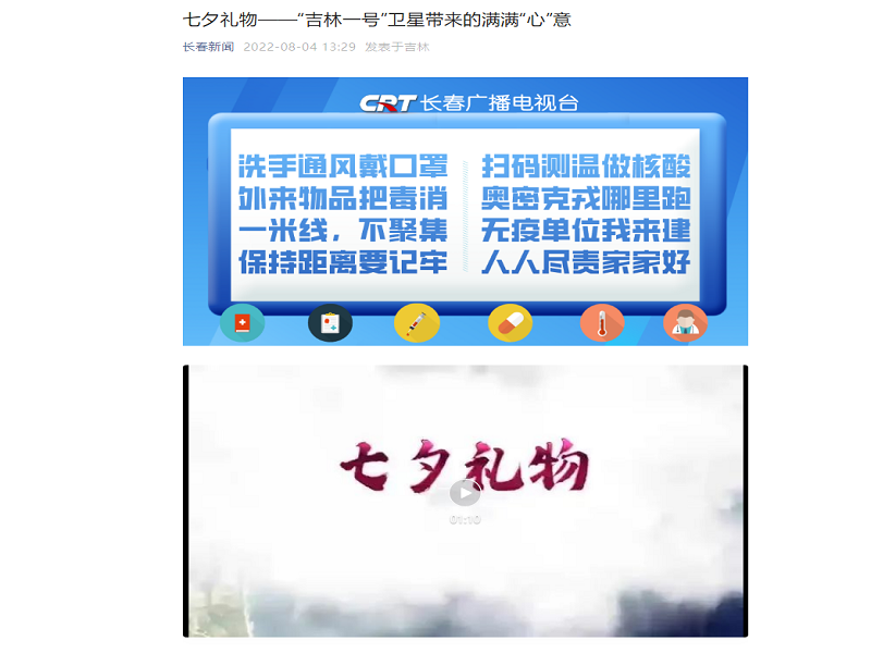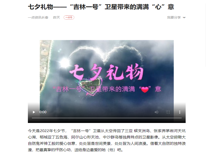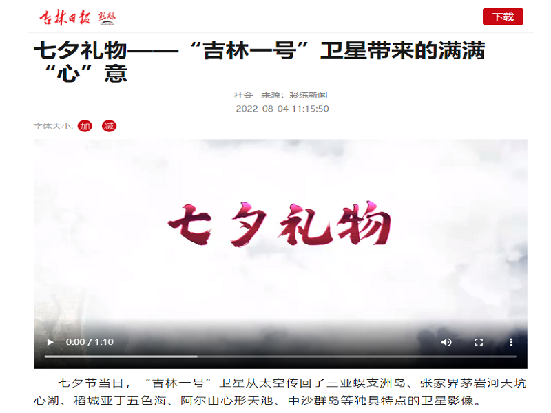 ● 吉林日报-七夕礼物——“吉林一号”卫星带来的满满“心”意 七夕节当日,“吉林一号”卫星从太空传回了三亚蜈支洲岛、张家界茅岩河天坑心湖、稻城亚丁五色海、阿尔山心形天池、中沙群岛等独具特点的卫星影像。 2022-08-04