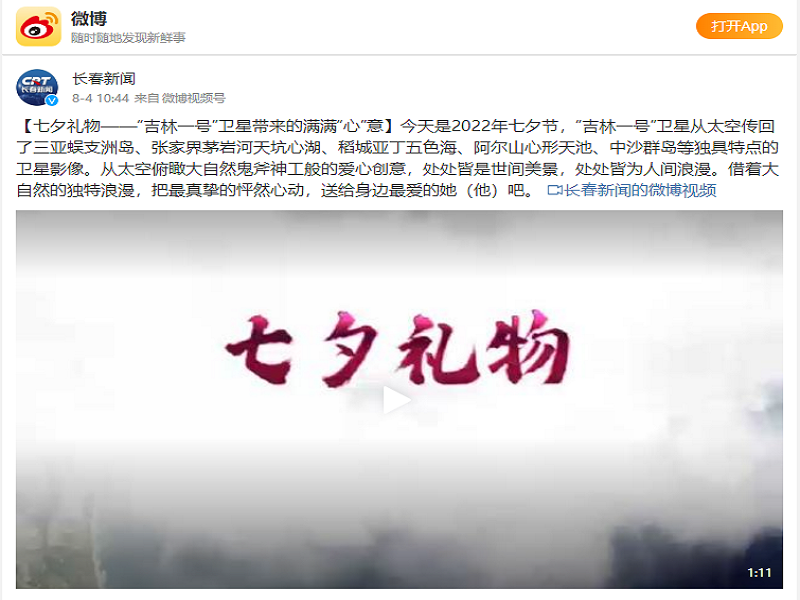 ● 长春新闻(微博)-七夕礼物——“吉林一号”卫星带来的满满“心”意 今天是2022年七夕节,“吉林一号”卫星从太空传回了三亚蜈支洲岛、张家界茅岩河天坑心湖、稻城亚丁五色海、阿尔山心形天池、中沙群岛等独具特点的卫星影像。从太空俯瞰大自然鬼斧神工般的爱心创意,处处皆是世间美景,处处皆为人间浪漫。借着大自然的独特浪漫,把最真挚的怦然心动,送给身边最爱的她(他)吧。 2022-08-04