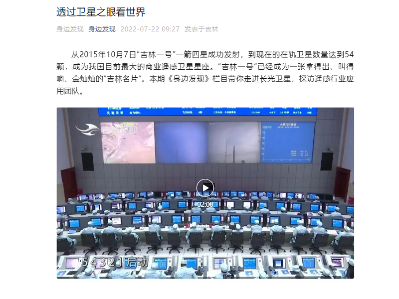 ● 身边发现-透过卫星之眼看世界 从2015年10月7日“吉林一号”一箭四星成功发射,到现在的在轨卫星数量达到54颗,成为我国目前最大的商业遥感卫星星座。“吉林一号”已经成为一张拿得出、叫得响、金灿灿的“吉林名片”。本期《身边发现》栏目带你走进长光卫星,探访遥感行业应用团队。 2022-07-22