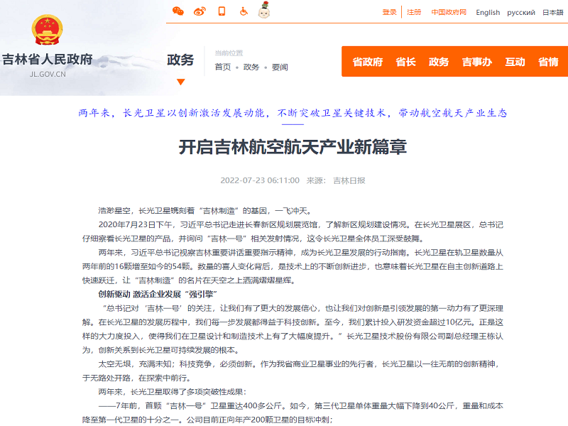 ● 吉林日报-开启吉林航空航天产业新篇章 浩渺星空,长光卫星镌刻着“吉林制造”的基因,一飞冲天。2020年7月23日下午,习近平总书记走进长春新区规划展览馆,了解新区规划建设情况。在长光卫星展区,总书记仔细察看长光卫星的产品,并询问“吉林一号”相关发射情况,这令长光卫星全体员工深受鼓舞。 2022-07-23